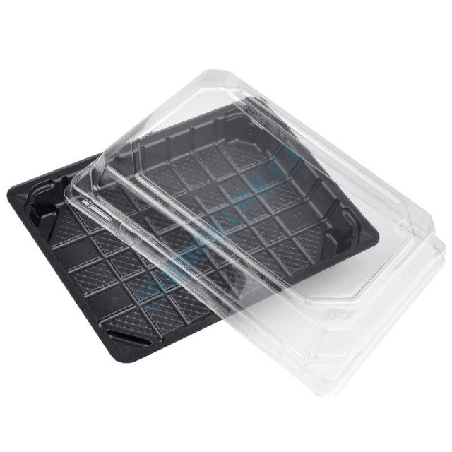 Black rectangular plastic sauce bowl with lid.Volume - 80ml.Length - 83mm.Width - 60мм.Height - 35mm.Suitable for hot and cold sauces.The package contains 100 pieces.The carton contains - 15 packages, 1500 pieces...