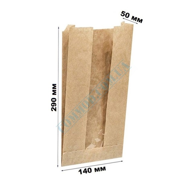 Пакеты бумажные с окном крафт 290x140x50мм (67) 1000 штук, артикул 67, пакет, бумажный, для, продуктов, хлеба, выпечки, с окном